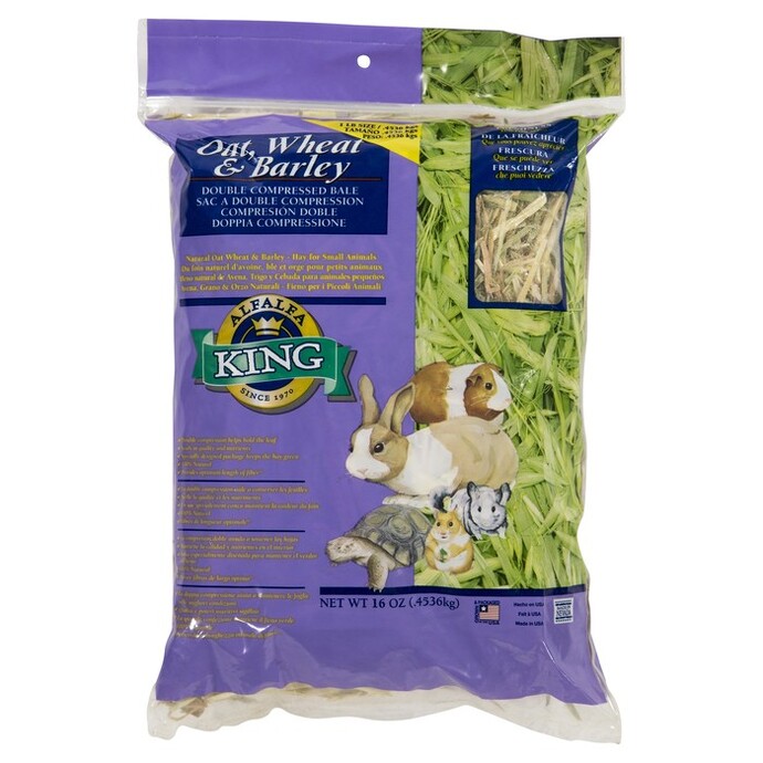 Alfalfa King’s unique double-compression process aids in preserving the leaf structure and sealing in vital nutrients. Hand-packed with care, every 16oz package of Oat, Wheat, and Barley Hay promises optimal freshness and unparalleled quality for your pet’s enjoyment.