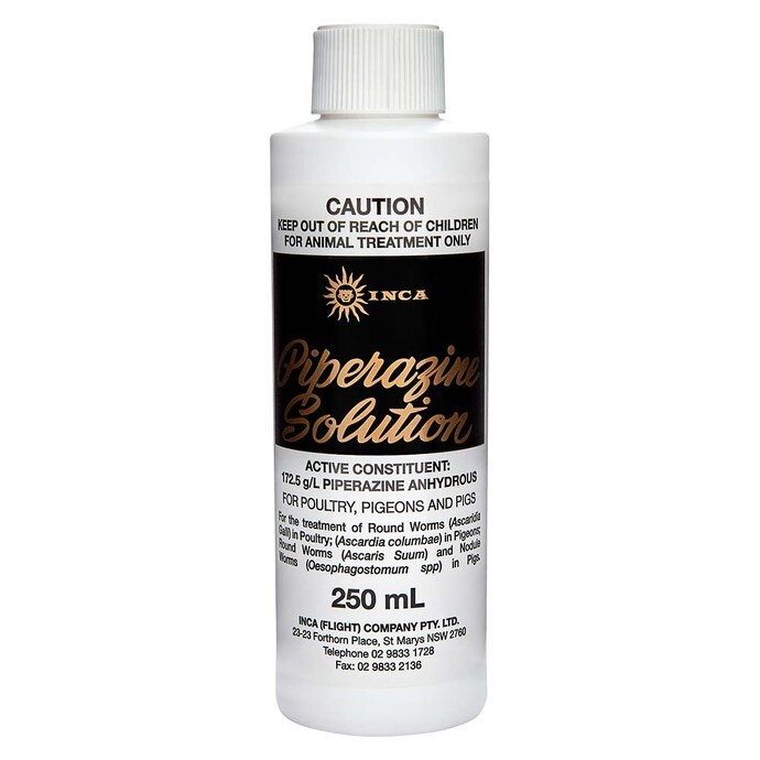The Inca Piperazine Poultry, Pigeon & Pig Wormer is a safe and effective solution to help protect your animals from roundworms and nodule worms. This 250ml bottle is designed to treat a variety of animals, including poultry, pigeons, and pigs.