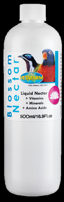 Introducing the Vetafarm Blossom Nectar Liquid Nectar in a generous 500ml bottle, designed to provide optimal nutrition for pet and wild lorikeets. This specially formulated liquid nectar blend is enriched with essential sucrose, fructose, glucose, amino acids, vitamins, and minerals, ensuring your feathered friends receive balanced and comprehensive nutrition in every drop.