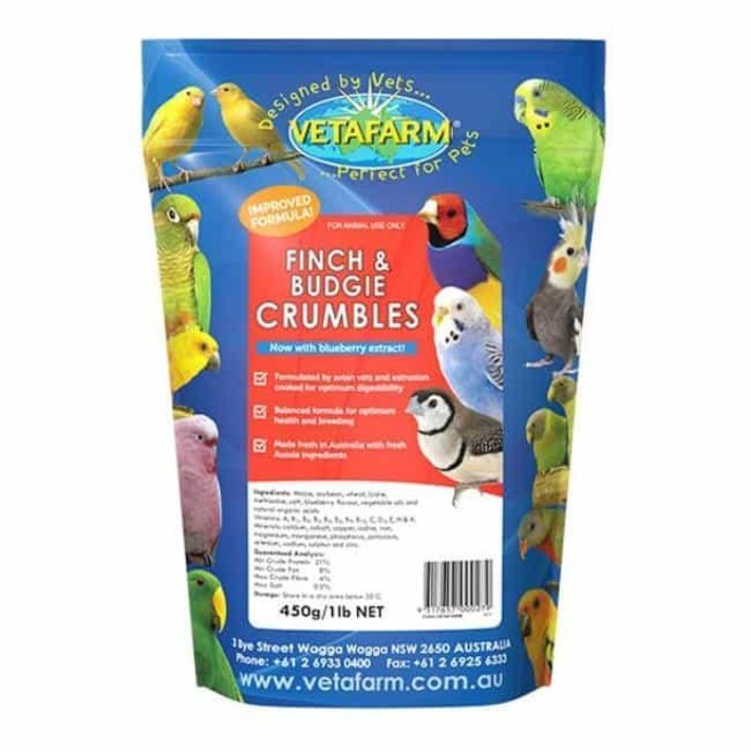 For the best results, offer Vetafarm Finch Crumbles as the primary food source, comprising 80% or more of your bird’s diet. This ensures your bird receives the complete nutrition required for a healthy life. Make sure to provide fresh water for your pet bird at all times.